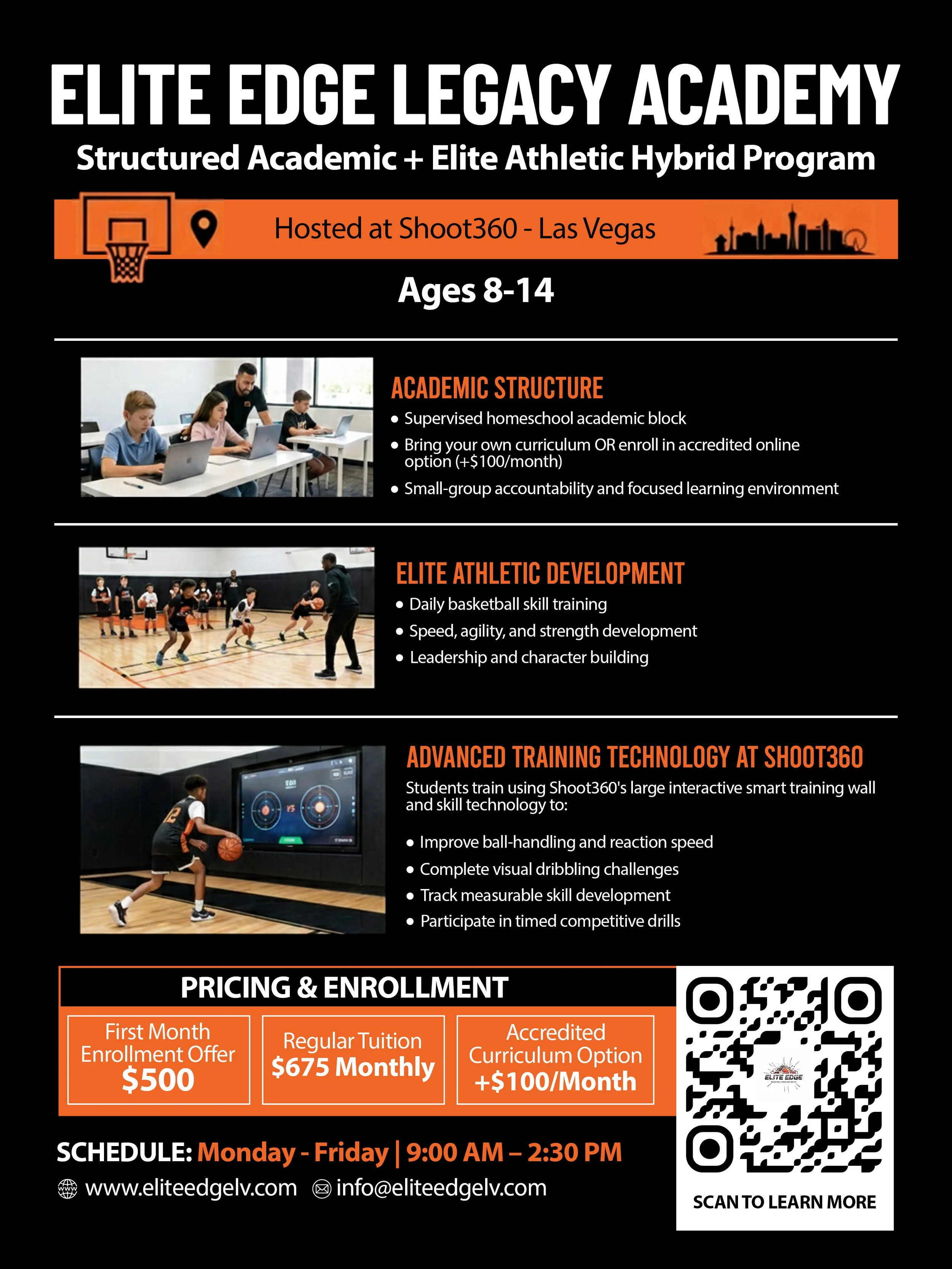 Elite Edge Legacy Academy is an organized academic and athletic development program for student-athletes ages 8–14. Our hybrid model combines supervised academic blocks with daily elite basketball training at Shoot360. Students develop discipline, accountability, leadership, and measurable athletic growth in a focused small-group environment designed for families seeking structure beyond traditional school or isolated homeschooling.